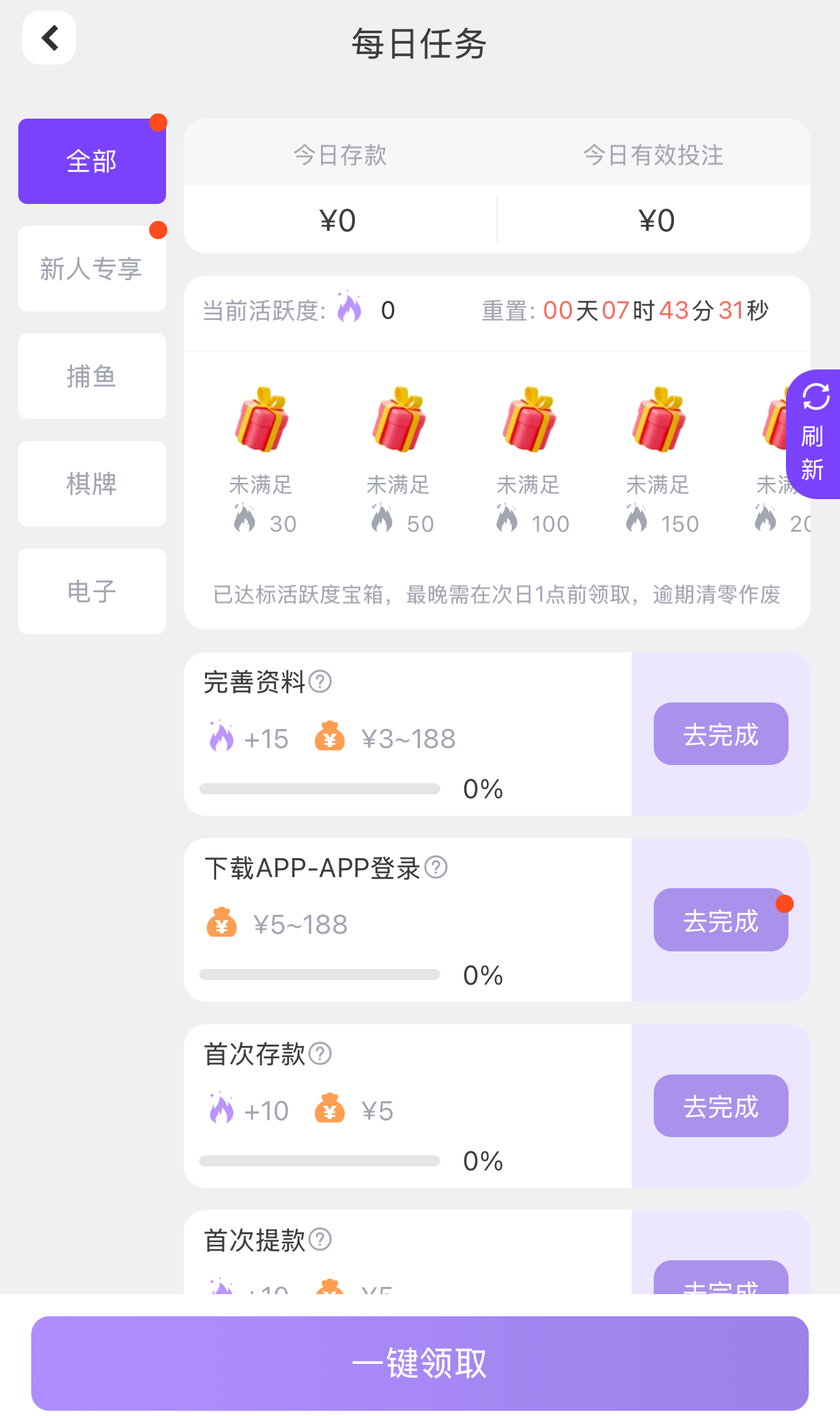 新用户注册绑卡完善所有资料,点击优惠-每日任务里面自助领取