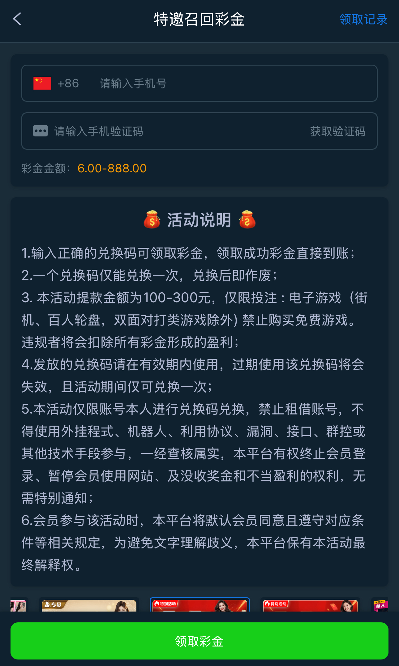 碰瓷特邀召回彩金,老用户有账号的去登录优惠大厅页面自助填写手机号碰瓷召回彩金